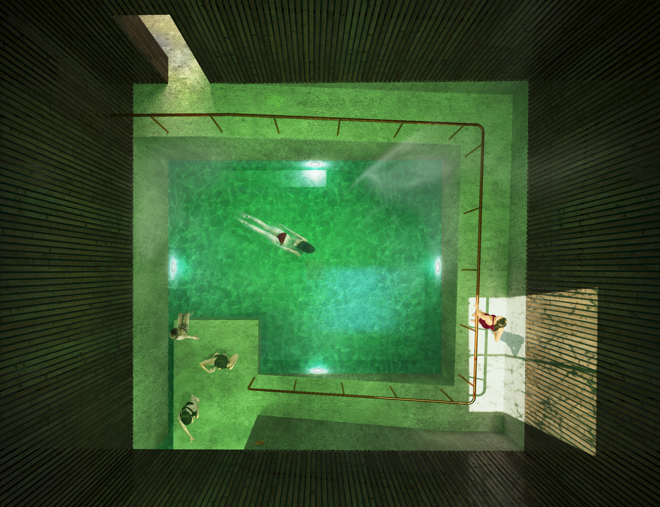 El proyecto fue abordado por el estudio desde la condición esencial del paisaje a intervenir. Dado su contexto puede considerarse como un vacio urbano, este espacio, rodeado de vegetación espontanea y sin edificaciones de gran escala a considerar, supone que cualquier intervención seria dominante sobre la visión única de su contexto. La edificación busca insertarse y pertenecer a su entorno. Se despliega de manera horizontal para ocupar el espacio máximo considerable en la parcela, lo que es posible porque no existen limites construidos a su alrededor. Partiendo de esta premisa, los arquitectos crean un volumen racional y complejo a la vez, con una configuración alargada y dominante sobre la línea del horizonte. A partir de este esquema, el segundo nivel se complejiza y adquiere diferentes alturas. En planta, los espacios se organizan dentro de un prisma regular, donde las piscinas ocupan el punto central y se retira la cubierta. Alrededor de las masas de agua se encuentran espacios anexos como baños, duchas, saunas y salas de masajes, entre otros, que se relacionan entre sí a través de estancias de transición libres que permiten una mayor flexibilidad programática. La edificación es elaborada enteramente en madera natural curada. Este material resulta idóneo para establecer vínculos con el contexto circundante mientras que, en el interior, permite preservar la temperatura por más tiempo y crear una atmósfera cálida. En su conjunto, la propuesta busca otorgar a sus visitantes un ambiente perfecto para deslindarse de la cotidianidad y disfrutar aguas termales.